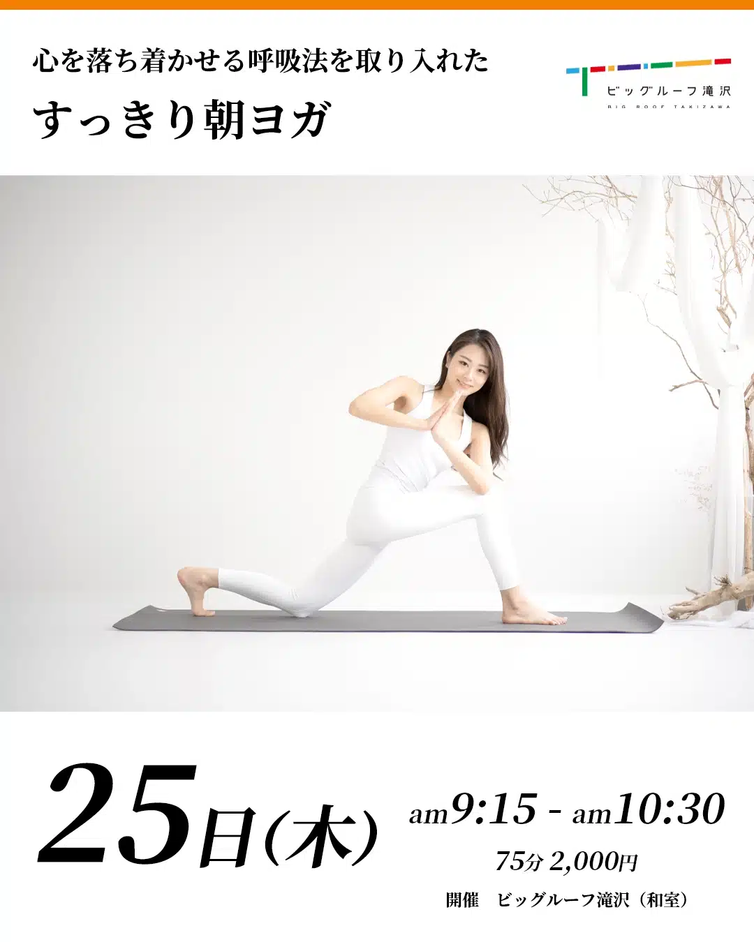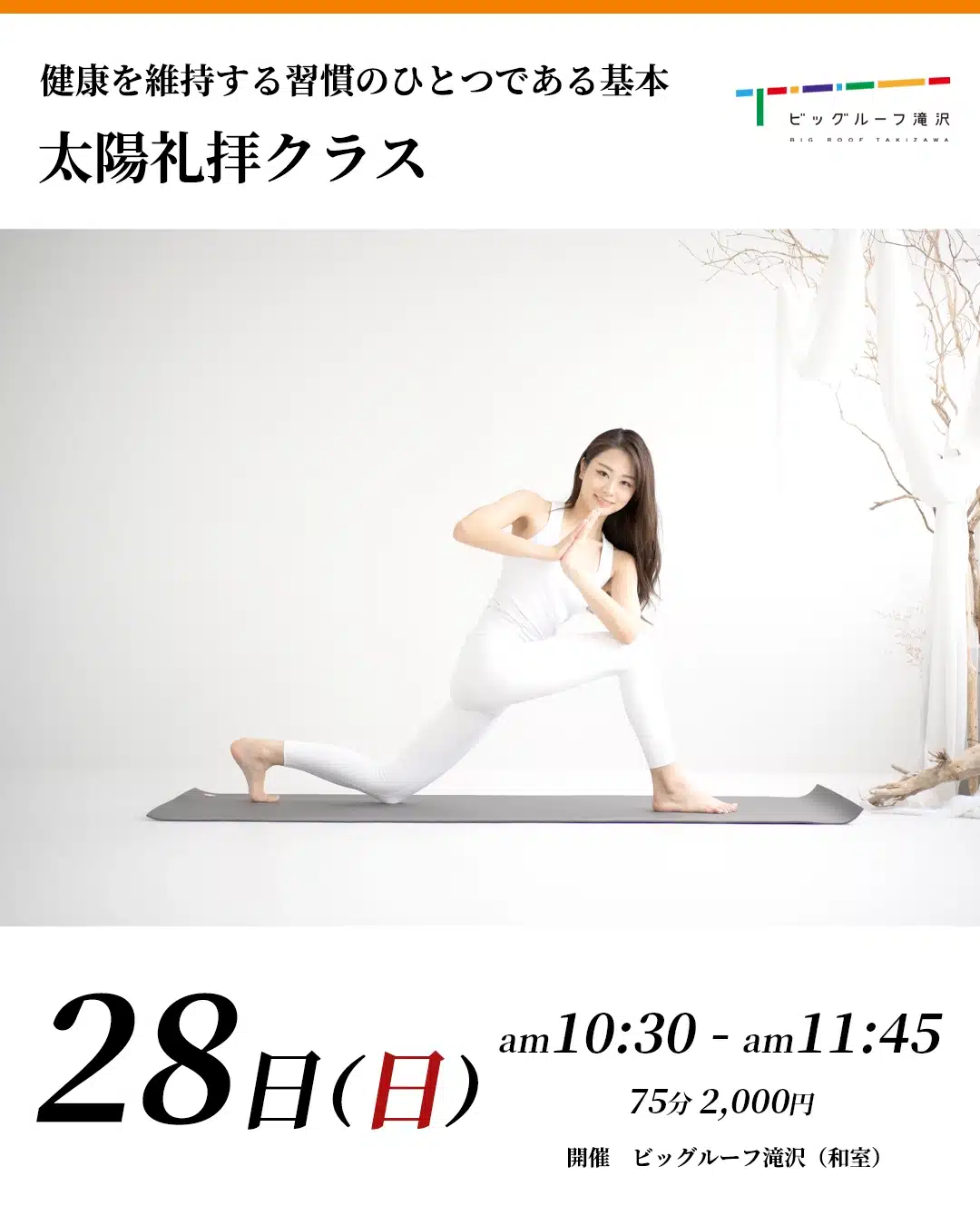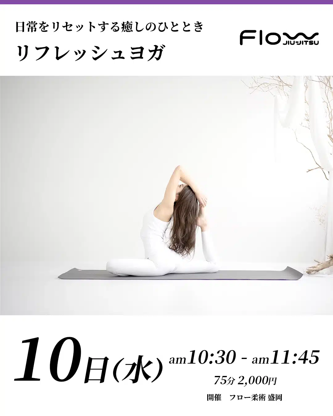 流れるように行う太陽礼拝を取り入れ、ゆったりと身体を伸ばしたり捻ったりするポーズを行います。自律神経を整える呼吸法にもチャレンジ!運動不足の方、心身共にスッキリしたい方におすすめです。