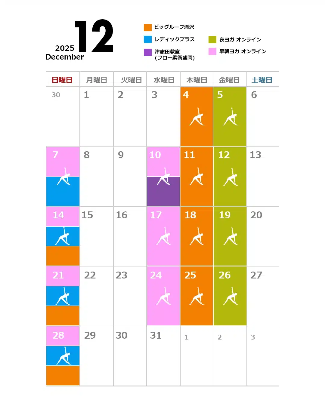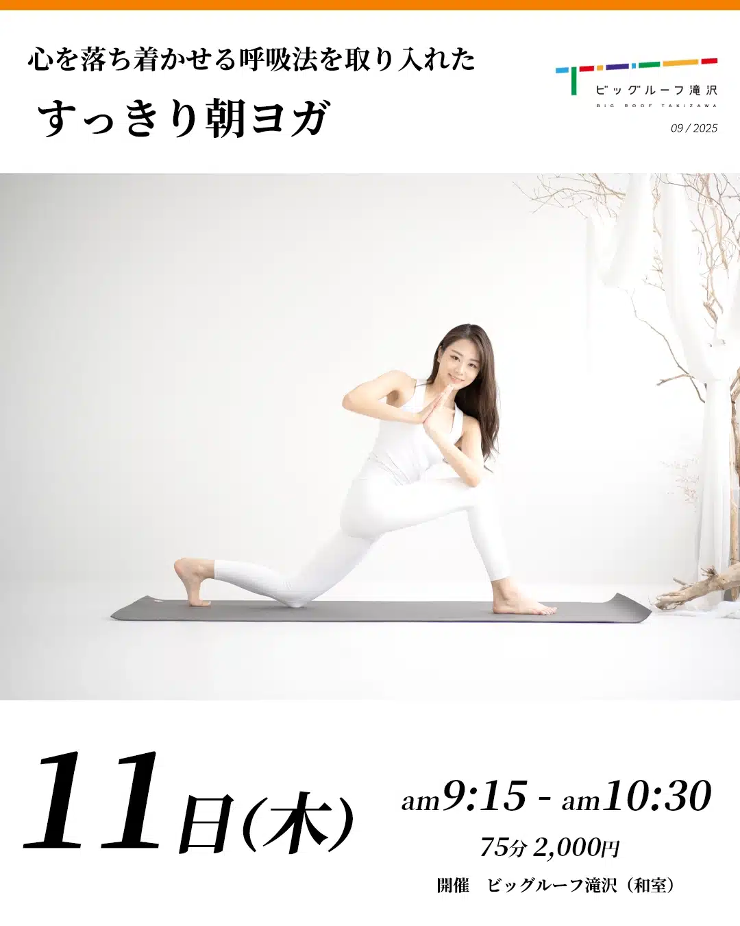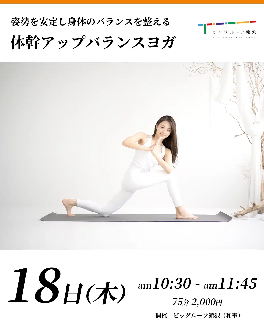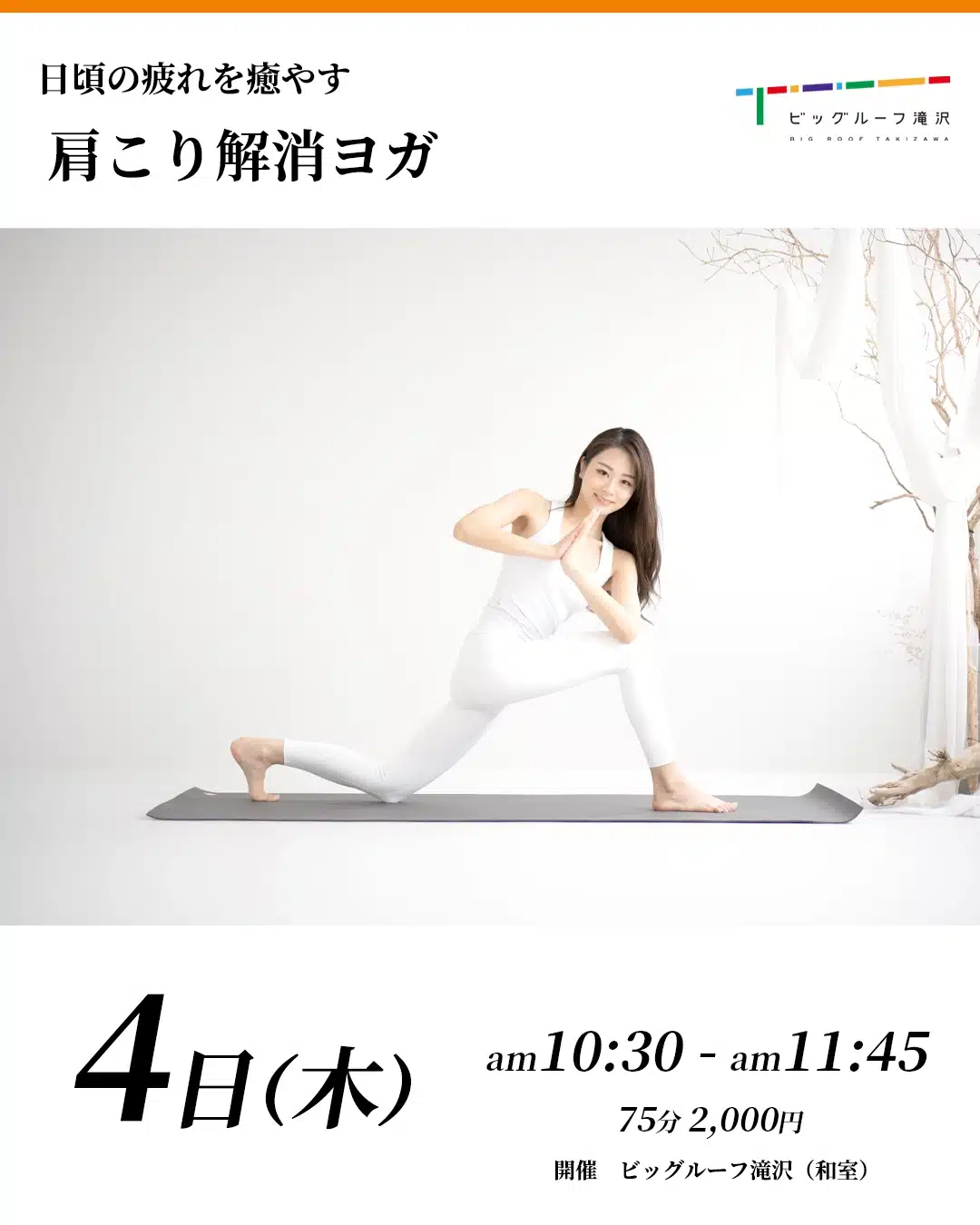 流れるように行う太陽礼拝を取り入れ、ゆったりと身体を伸ばしたり捻ったりするポーズを行います。自律神経を整える呼吸法にもチャレンジ!運動不足の方、心身共にスッキリしたい方におすすめです。