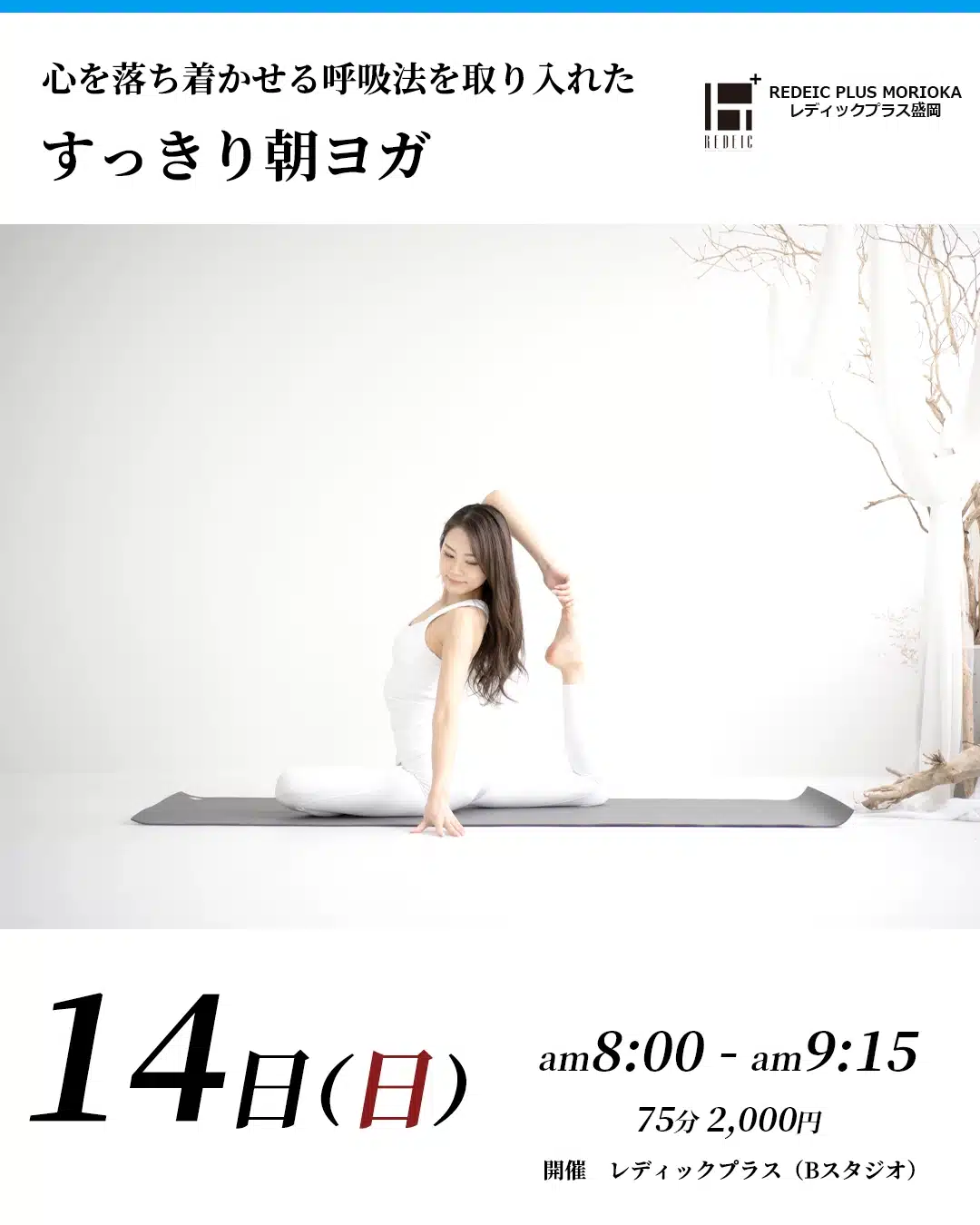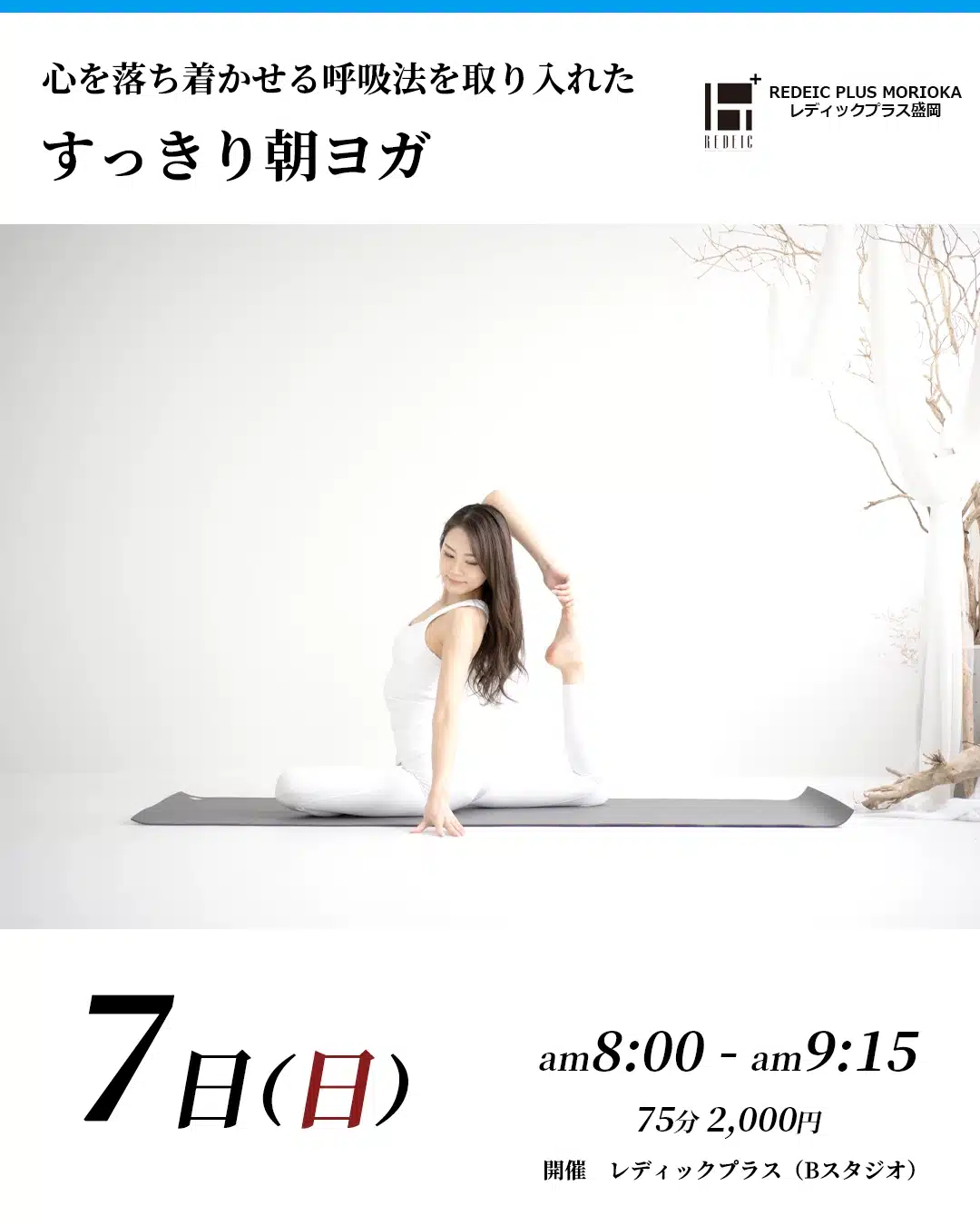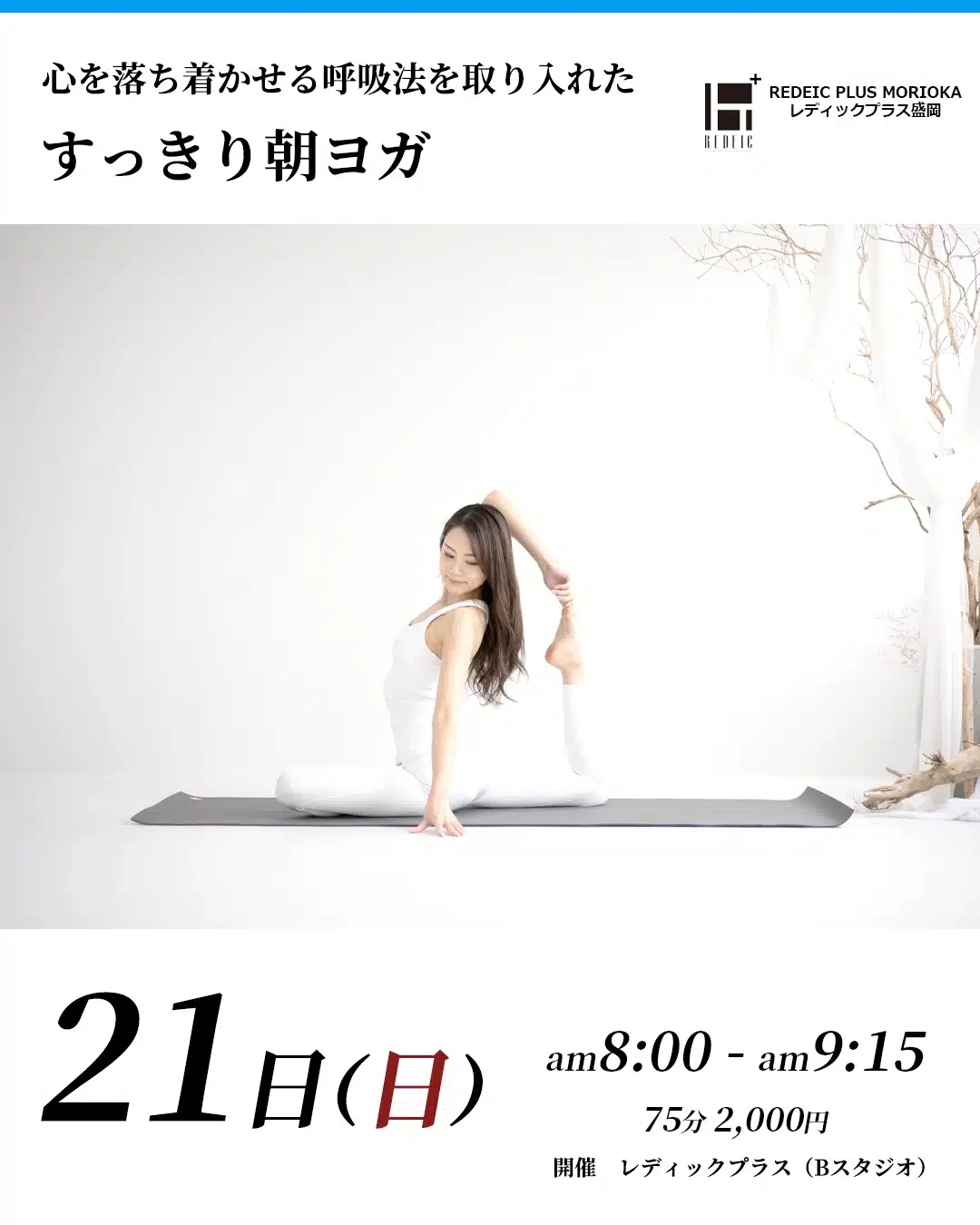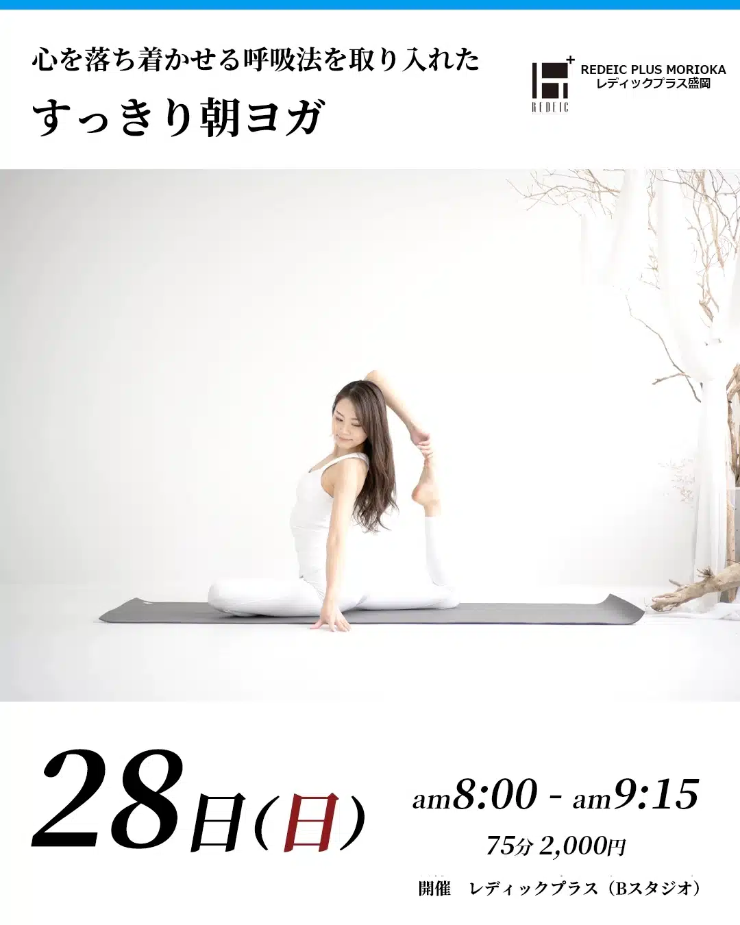 1日の始まりである大切な朝にヨガを取り入れる事で身体が目覚め、筋肉のこわばりがほぐれることで血流が促され、代謝アップや浮腫解消に繋がります。元気に過ごしたい方におすすめです。